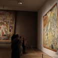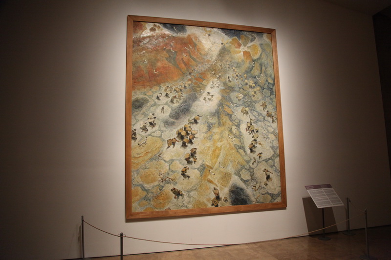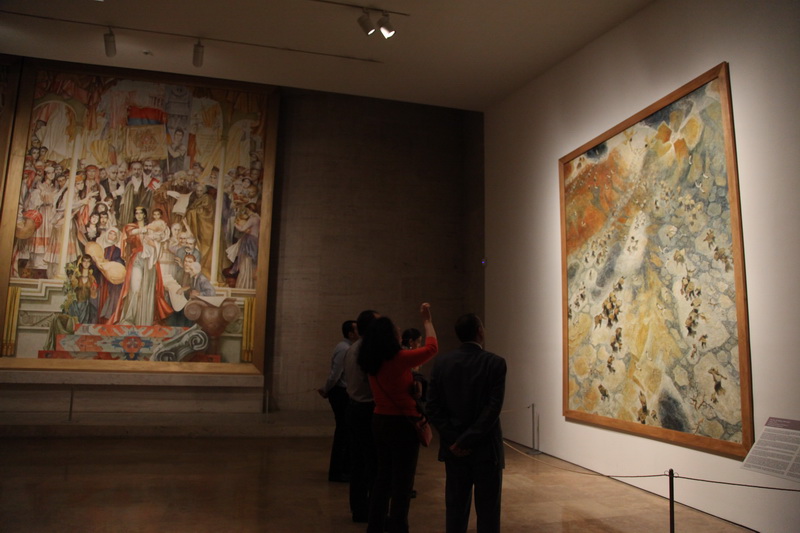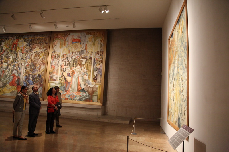A Solo Artwork: MigrationMay 16, 2015 – June 21, 2015This subject occupied the artist’s mind for 15 years. He began working on the first painting in January of 1965. As he wrote in his diary, “I read and study information about the Armenian massacres; the exhibition should be inaugurated in spring.” Elsewhere, he wrote: “Thus, I worked on Migration for 25 days; it was a period of intense creativity, I worked very hard. The composition was made of 100 figures; I had to paint all of them one by one. I completed the work in a very strong style, within a conventional environment and symbolically. At the exhibition, the work received unanimous approval, having a shocking impact on some people.” The first example (140x122 cm) was executed with an almost monochrome, restrained dark brown-blue palette, typical of the artist for that period, in his unique cubist-expressionist style, by presenting endless columns of people sprawling by the sloping surface of a bare, harsh desert (perhaps mountains). Although they move from darkness to light, the general mood of the picture is tragic, painful. The small outline of the St. Hripsime Church is seen in the distance. The painting was called Road of Salvation. In 1967 Suren Pipoyan made a copy of the painting in a larger size, 200x160 cm. This work was called Toward a New Armenia, in line with the ideology of Soviet Armenia. In 1979 Pipoyan decided to address the subject once again, basically maintaining the same composition, but giving it a completely new interpretation and style of execution. First and foremost, the size of the painting was much larger than the previous one, 375x300 cm. The color scheme was also changed: from dark brown to gold-yellow, white, and blue-gray. An important detail was added; the refugees are received by angels. During work on the canvas, the artist studied Armenian national costumes. The Armenians, forcefully evicted from their homes, march through a yellow desert, carrying precious relics such as books, icons, cross-stones, while holding a child, or a sick relative. Among them, one can discover the image of Komitas. The children and people seem to be taken by the wind; they resist somehow, but keep going. The birds scream. The migrants go straight into the embrace of angels. They go to heaven, or a new Armenia. The outline of St. Hripsime Church is seen in the distance. The painting is tragic and life asserting at the same time, with its golden coloring and pulsing rhythm. This is one of those rare paintings on the Armenian Genocide that confirms the faithfulness of the Armenian people to their culture and their enormous energy to thrive. The work was exhibited at the Artists’ Union of Armenia in 1980 and received the Best Artwork of the Year award. Later, for many years, it was exhibited at the conference hall of the Museum-Institute of the Armenian Genocide. It is currently the property of the artist’s family.