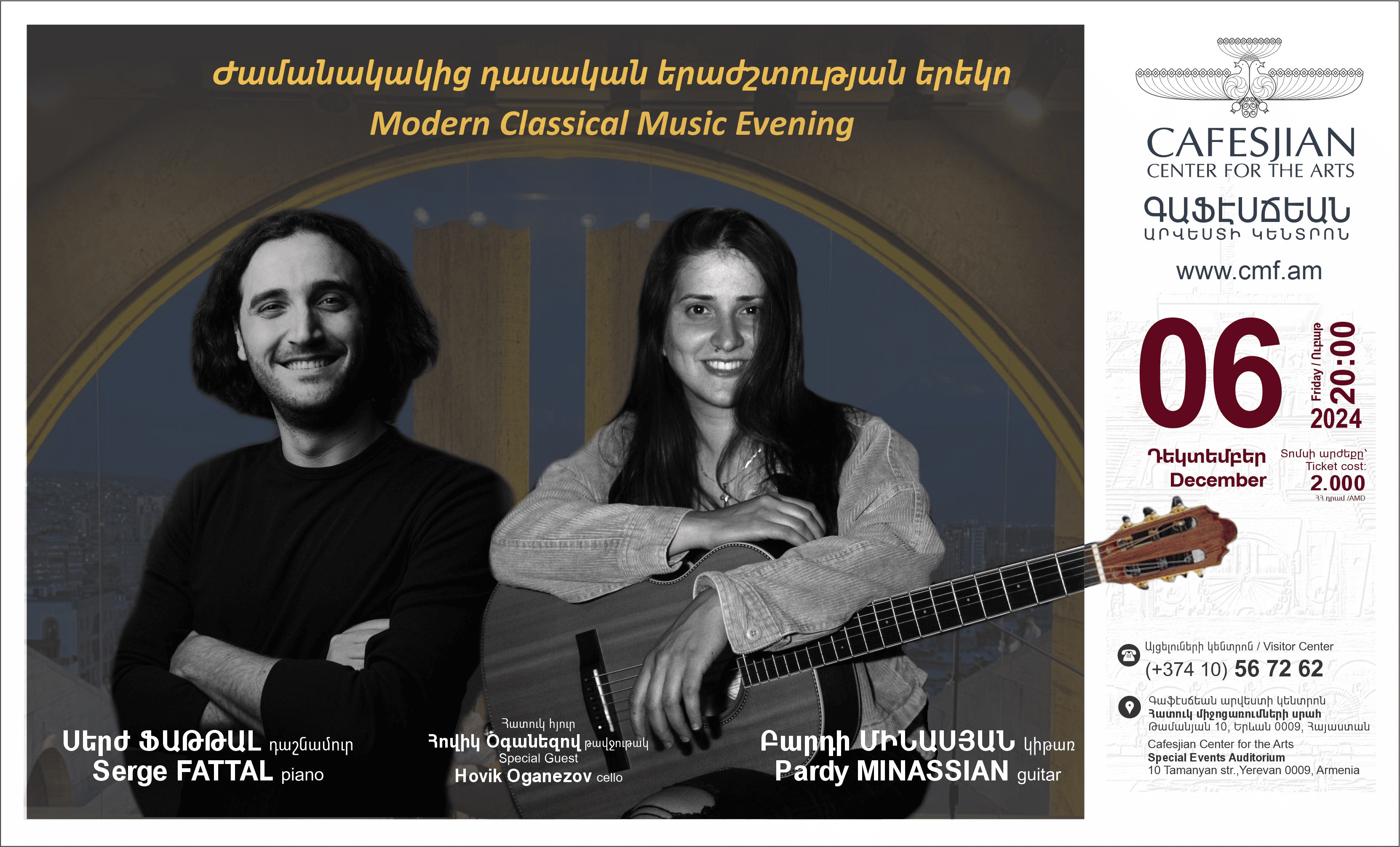 Cafesjian Classical Music Series: Modern Classical Music EveningDecember 06, 2024 Cafesjian Classical Music Series presents:Modern Classical Music Evening Performers: Pardy Minassian - guitar Serge Fattal - piano Special Guest։ Hovik Oganezov – cello Program: Tedesco, Rautavaara, Pasieczny, Khatchaturian, Fattal and others. The concert starts at 20:00 Ticket price: 2.000 AMD For reservations and inquiries, please call +374 10 567262. Only CCA Members can reserve a table through a phone call. Please remember we have a special reservation service –you can SELECT YOUR FAVORITE TABLE at the Special Events Auditorium! Just stop by the Visitor Center to select the table you prefer as you buy tickets. We shall make sure your favorite table is reserved for you! Become a member of the Cafesjian Center for the Arts and receive a 10% discount on tickets to all concerts, events, and merchandise in the Museum Store. Other materials from this section