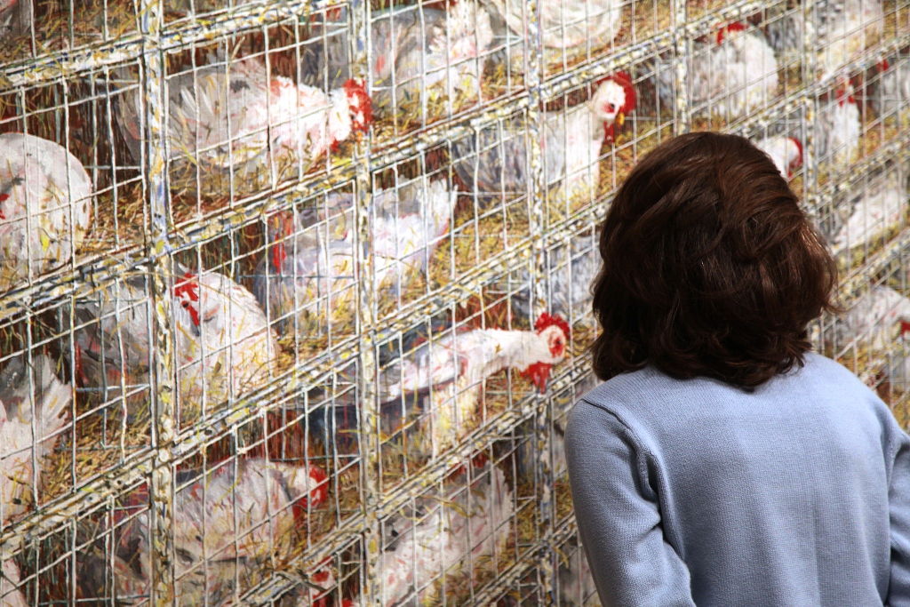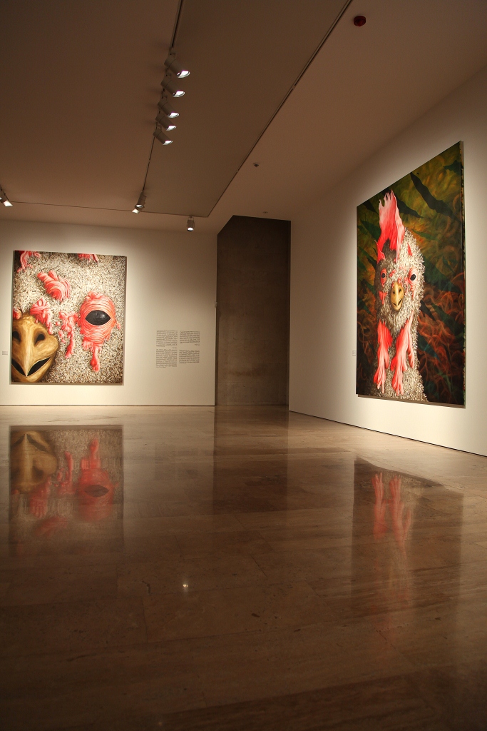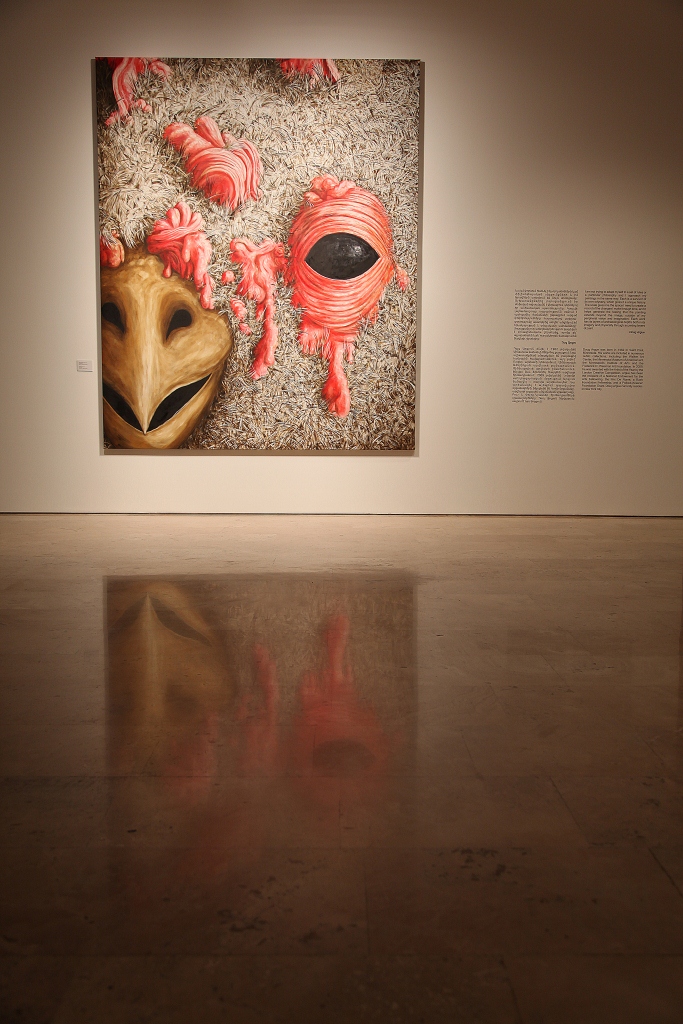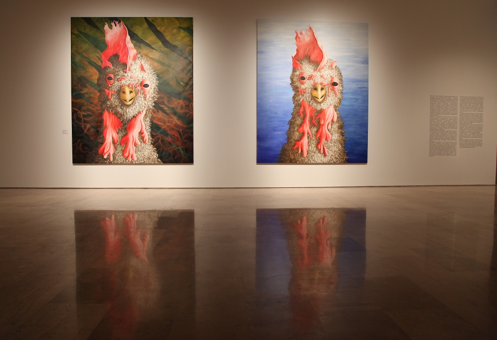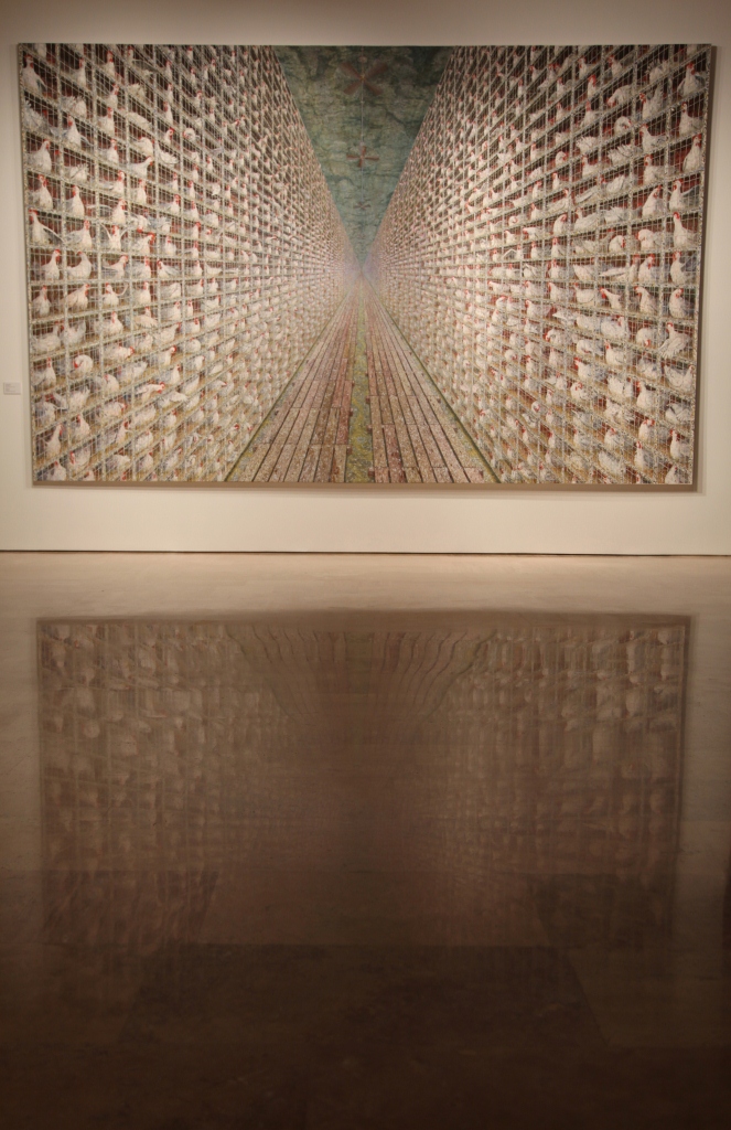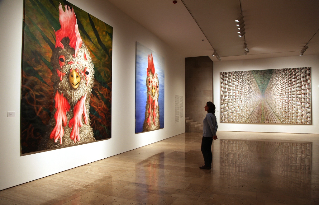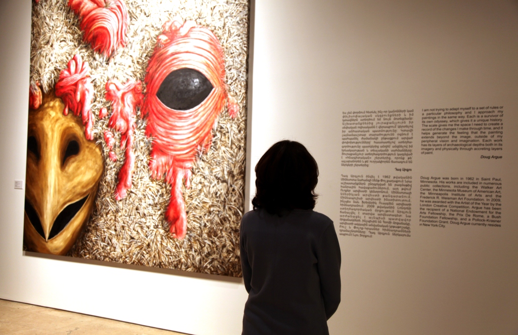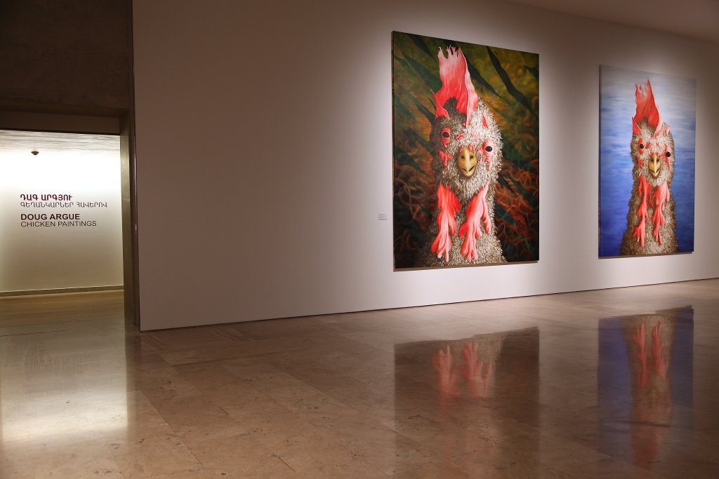 Doug Argue: Chicken PaintingsOctober 13, 2013 – March 30, 2014Doug Argue The power of art is unconventional, free of artist’s mind and the subject’s visual representation. The works by contemporary American artist Doug Argue convey this independence, revived in each viewer and mind. He is a prolific artist whose intellectual and conceptual spectrum encompasses a wide range of creative series executed in different media. Inspired by Renaissance painters, especially Tintoretto, also impressive works of Jackson Pollock, Argue explores the infinite space in constructing his images and creates works of grandiose scale, where ordinary objects are monumentalized and reconceptualized within the vortex of contemporary society. The Untitled chicken painting and the three chicken portraits from the Gerard L. Cafesjian Collection impress with their overwhelming scale and meticulous execution. The Chicken Painting which took the artist two years to complete is all imaginary, prompted by a short story of Franz Kafka. Before arriving in Armenia, the Chicken Painting was a major public attraction at the Weisman Art Museum, after Gerard Cafesjian lent the work to the University of Minnesota in 1995. The postexecution echo of the work goes beyond the artist’s initial goal of “creating infinity and diversity in a finite space”. The rectangular matrix of the image, which creates a vacuumlike cube receding into endlessness, produces a giant X in the centre of the painting that seems to challenge the congruence of the simplicity of the composition and the inherent complexity of the work. A chicken factory… or an ecological indictment on growing consumerism with 50 billion chickens raised annually as a source of food… or a social commentary on the increasing alienation of humans caged in their virtual cubes? Doug Argue expands the chicken concept, creating a series of individualized personalities of chickens, which with their cockeyed, dizzy expressions appear as enigmas or anonymous historical portraits. Here, the most overlooked animals in the world become “an equivalent of a big battle expressing an important shift in human culture”, initially envisioned by the artist. The exhibition Doug Argue: Chicken Paintings opened on October 13 and will last till December 29, 2013. Doug Argue was born in 1962 in Saint Paul, Minnesota. His works are included in numerous public collections, including the Walker Art Center, the Minnesota Museum of American Art, the Minneapolis Institute of Arts and the Frederick R. Weisman Art Foundation. In 2009, he was awarded with the Artist of the Year by the London Creative Competition. Argue has been the recipient of a National Endowment for the Arts Fellowship, the Prix De Rome, a Bush Foundation Fellowship, and a PollockKrasner Foundation Grant. Doug Argue currently resides in New York City.