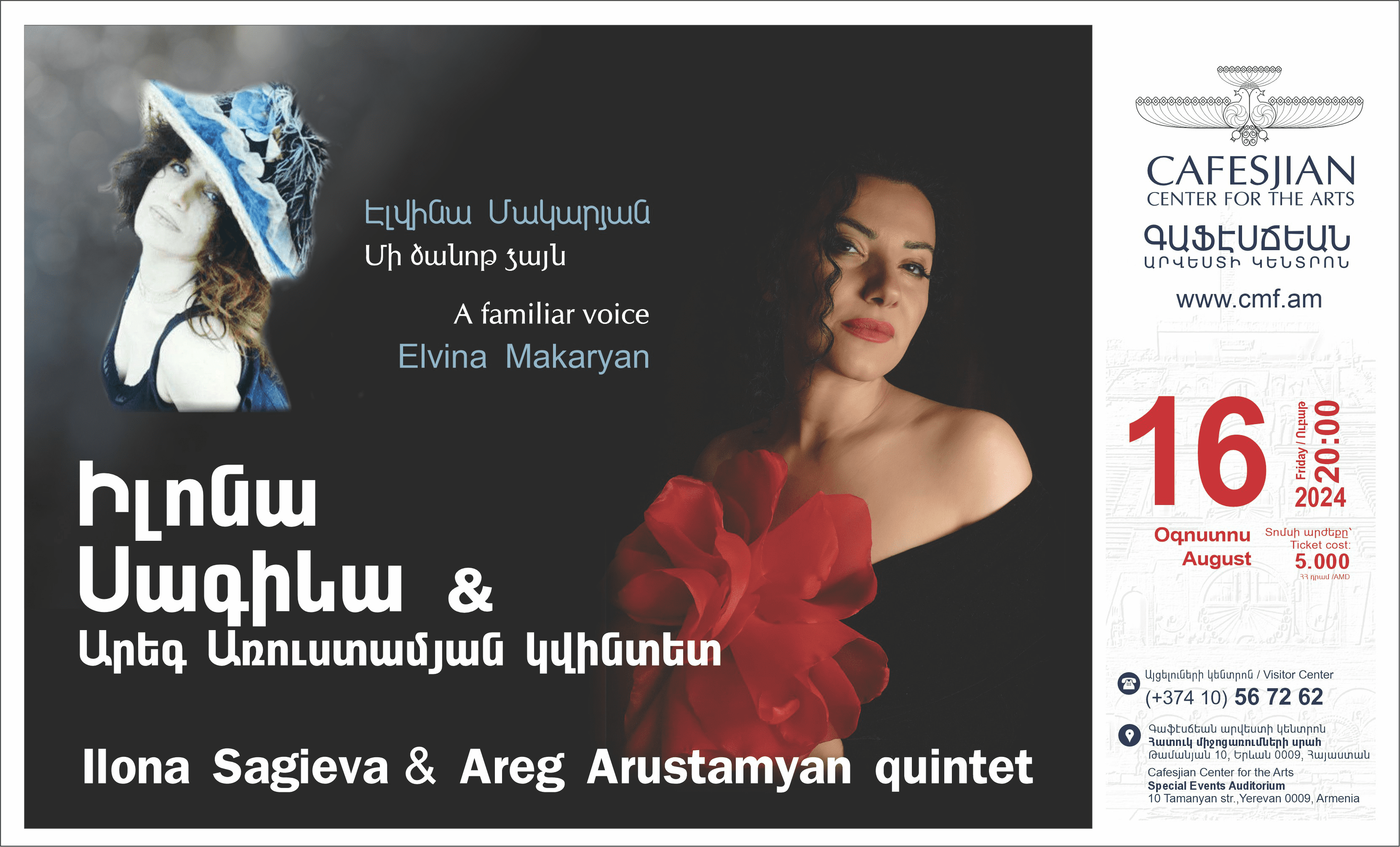 MUSIC CASCADE - Ilona Sagieva - Elvina MakaryanAugust 16, 2024 “Music Cascade” concert series presents:Ilona Sagieva - Elvina Makaryan Ilona Sagieva and Areg Arustamyan quintet present a concert dedicated to Elvina Makaryan's 74th birthday. Program: Elvina Makaryan's songs The concert starts at 20:00 Ticket price: 5.000 AMD For reservations and inquiries, please call +374 10 567262. Only CCA Members can reserve a table through a phone call. Please remember we have a special reservation service –you can SELECT YOUR FAVORITE TABLE at the Special Events Auditorium! Just stop by the Visitor Center to select the table you prefer as you buy tickets. We shall make sure your favorite table is reserved for you! Become a member of the Cafesjian Center for the Arts and receive a 10% discount on tickets to all concerts, events, and merchandise in the Museum Store, except for local crafts. Other materials from this section