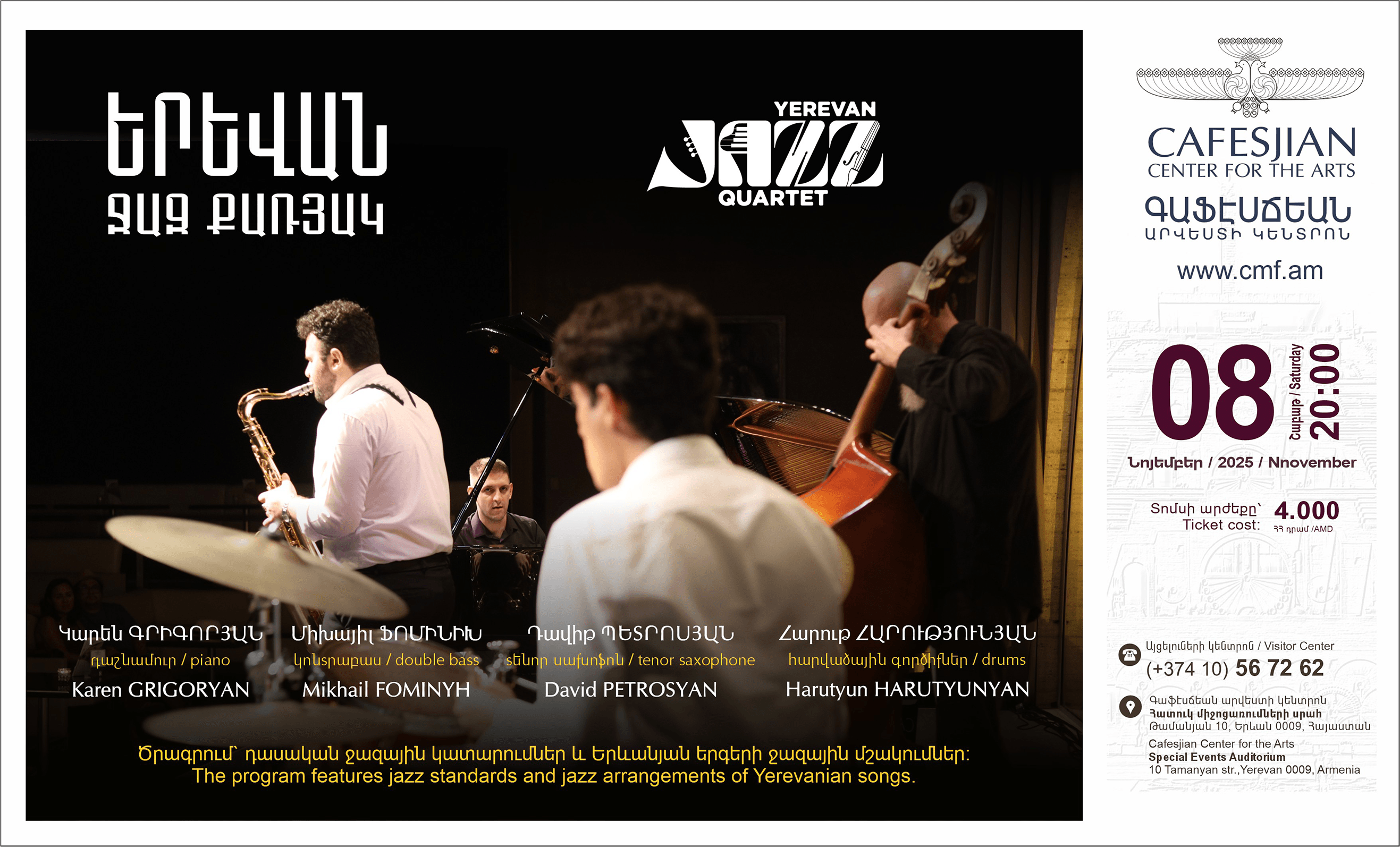 MUSIC CASCADE - YEREVAN JAZZ QUARTETNovember 08, 2025 “Music Cascade” concert series presents:YEREVAN JAZZ QUARTET David PETROSYAN - tenor saxophone Karen GRIGORYAN - piano Michail FOMINYH - double bass Harutyun HARUTYUNYAN - drums The program features jazz standards and jazz arrangements of Yerevanian songs. The concert starts at 20:00 Ticket price: 4.000 AMD For reservations and inquiries, please call +374 10 567262. Only CCA Members can reserve a table through a phone call. Please remember we have a special reservation service –you can SELECT YOUR FAVORITE TABLE at the Special Events Auditorium! Just stop by the Visitor Center to select the table you prefer as you buy tickets. We shall make sure your favorite table is reserved for you! Become a member of the Cafesjian Center for the Arts and receive a 10% discount on tickets to all concerts, events, and merchandise in the Museum Store. Other materials from this section